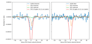 La línea de fosfato detectada por ALMA. Izquierda: Datos de Greaves. Derecha: Datos de Villanueva. Extracto del paper de Villanueva.